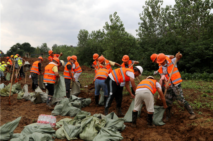 武漢建工集團(tuán)防汛搶險第一分隊的260多位隊員與數(shù)十臺搶險車輛及機(jī)械設(shè)備,在武漢市東西湖區(qū)濱河南路集結(jié)待命。